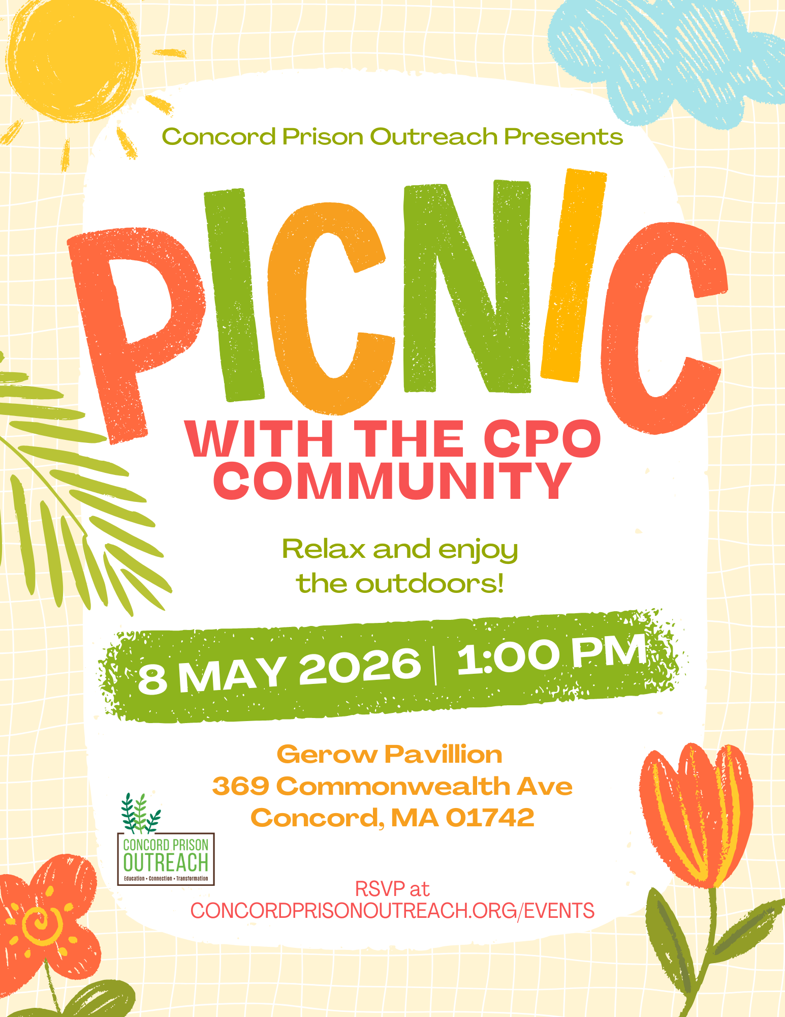 Mark your calendars and stay tuned for more details about CPO’s Community Picnic beginning at 12:00 PM on May 1st, located at Gerrow Park, along the Bruce Freeman Rail Trail in Concord, MA. We may even get to see some blooming daffodils that CPO volunteers planted last fall at the Concord Reformatory Prison Cemetery!